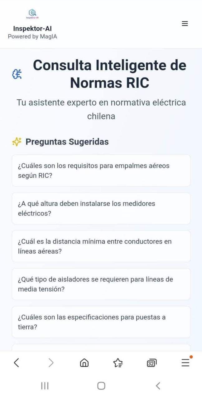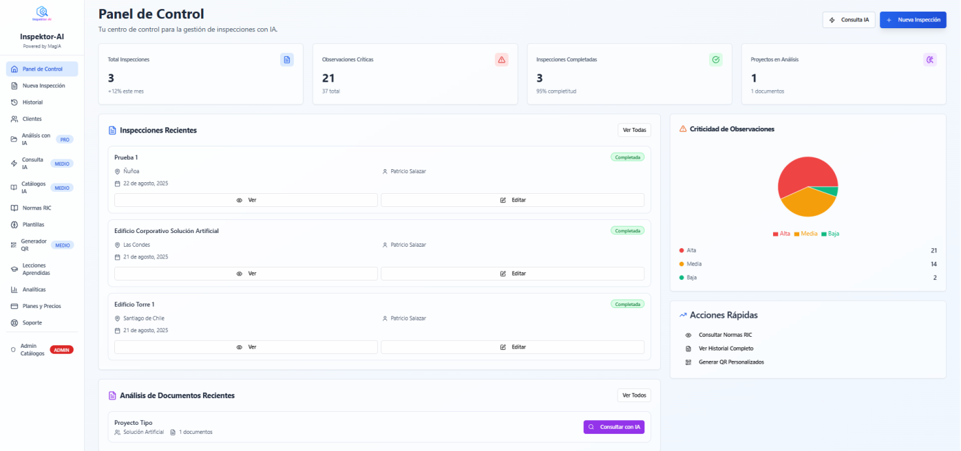 Aceleramos procesos de inspección con algoritmos inteligentes que reducen drásticamente los tiempos de desarrollo y producción.Inspektor-AI genera resúmenes ejecutivos automáticos, consulta normativas RIC en tiempo real y crea reportes profesionales en segundos, eliminando el 80% del trabajo manual tradicional.